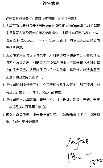 1998年9月,新天进公司与辽宁某石化公司签定合同,进行其10万吨/年苯乙烯精馏系统粗苯乙烯和精苯乙烯塔内件设计及制造,并于98年11月通过中石化集团公司组织的专家评审(评审会照片、现场评审照片、评委名单、评审意见)。99年12月一次开车成功。