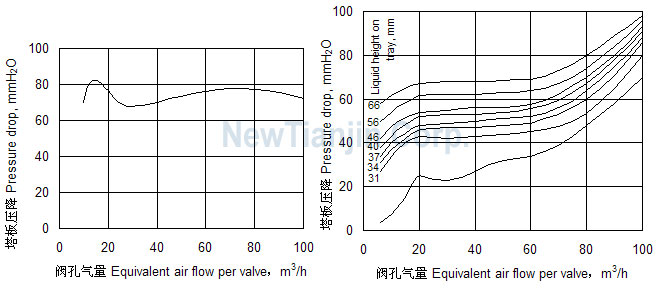 the valve cage into the liquid. Comparing to normal valve, this valve is not easy fall off or locked. It has high loading range about 1:6. Through this range the pressure drop and tray efficiency remain almost constant. The tray hole diameter is 50mm. JCV Tray's valve perforation density and distributing can be designed similar to normal valve tray. The pressure drop and efficiency curves of JCV Tray are given below.